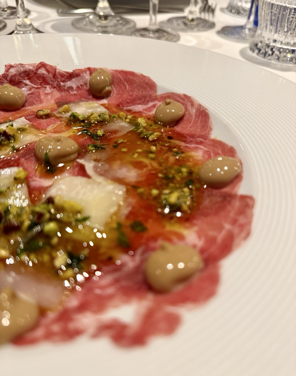 Carpaccio de presa ibérique, vinaigrette de pistaches et persil, mayonnaise au vinaigre de Modena
